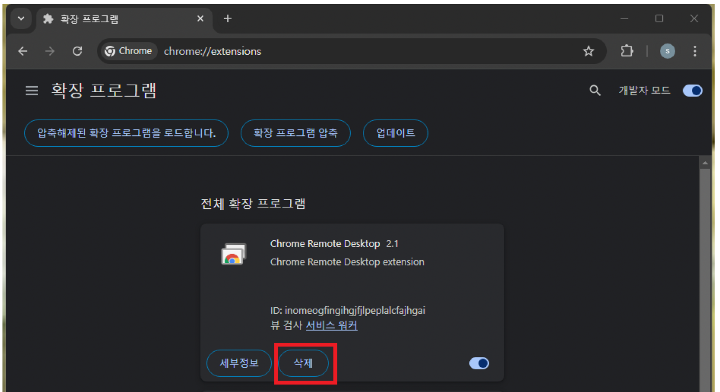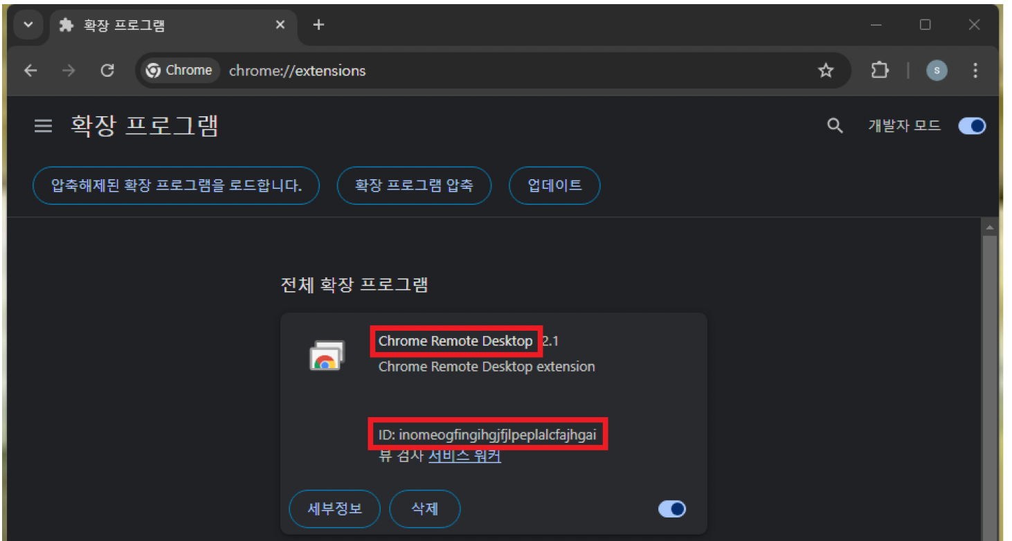 확장프로그램의 이름(chrome remote desktop)과 ID가 오류창에 표기되어있는 부분과 동일한지 확인합니다.