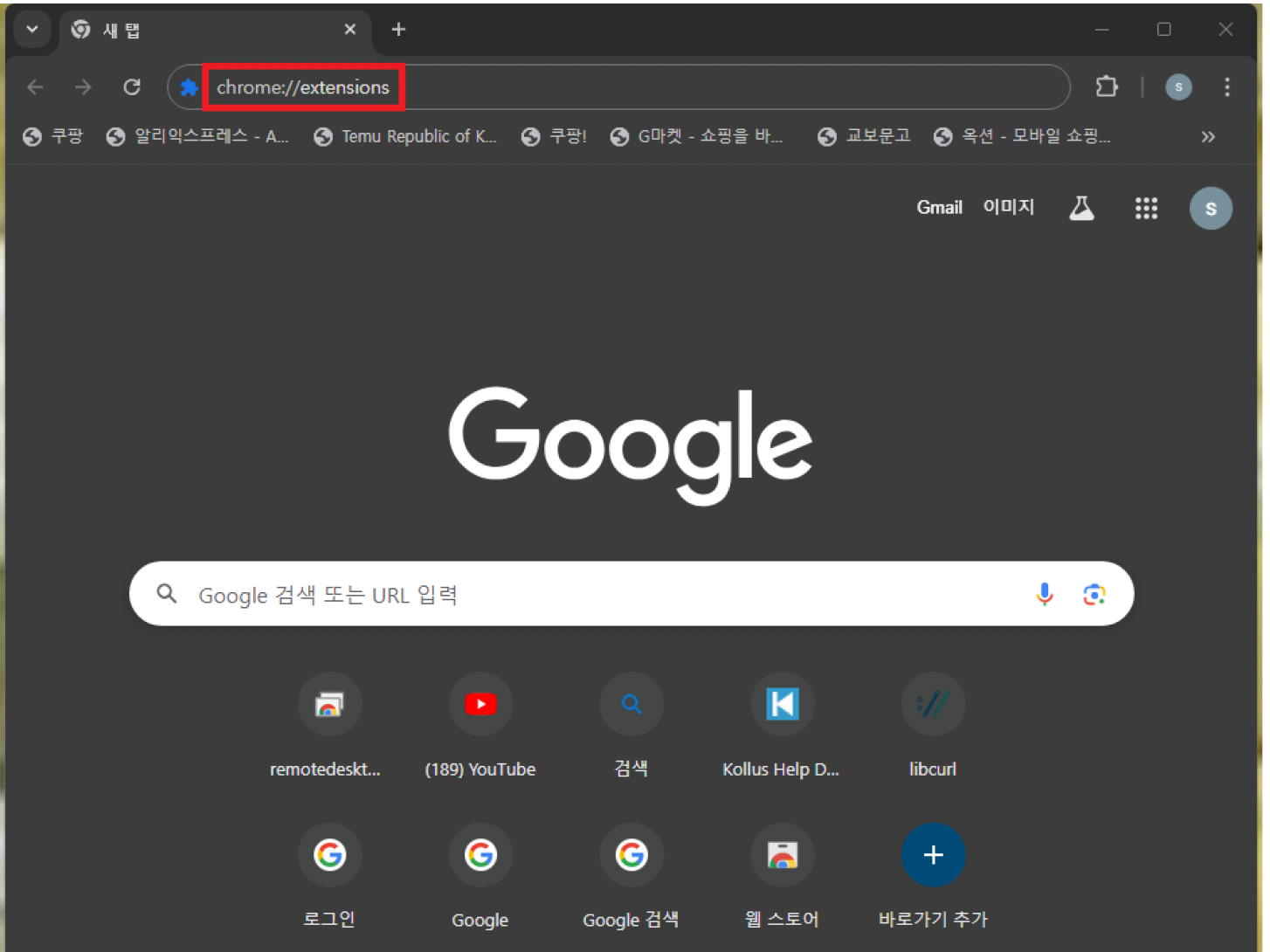 브라우져의 URL입력란(주소입력란)에 chrome://extensions를 입력 후 enter키를 누릅니다.